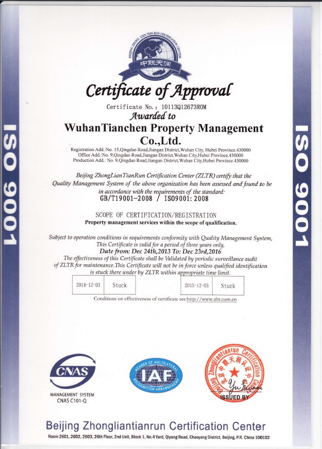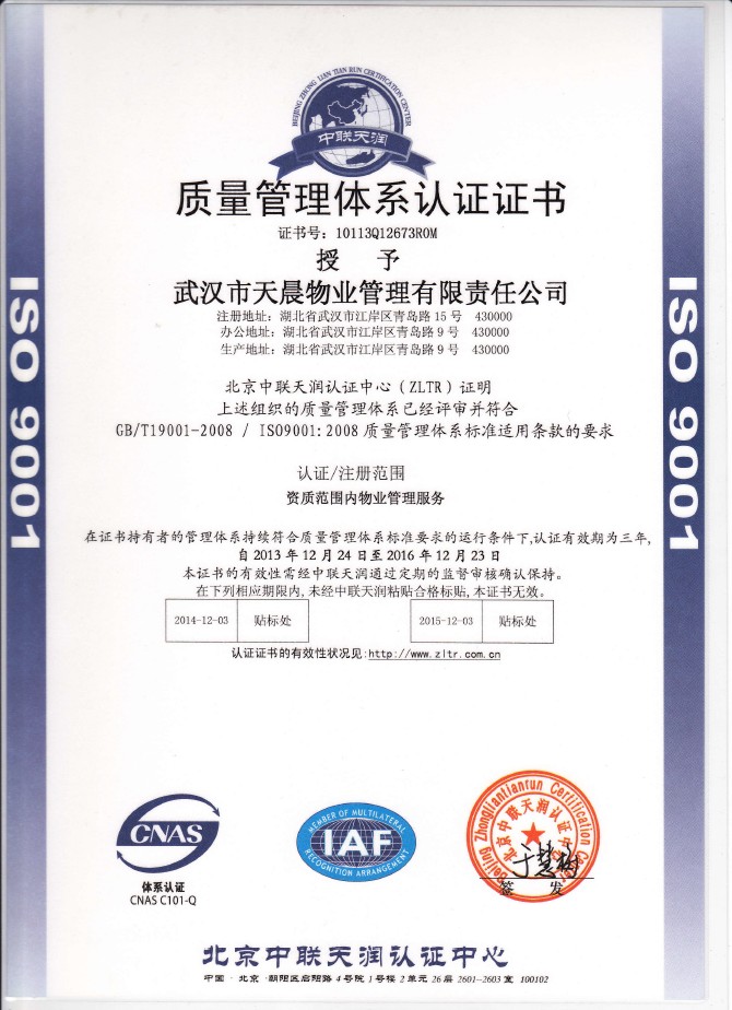 一直以来,天晨物业华体会hth·(体育)(中国)官方网站秉承“敬人敬业,追求卓越”的企业文化理念和“质量第一、用户至上”的服务理念,全面推行ISO9001质量认证体系,并于2012年元月1日开始实施运行,按照华体会hth·(体育)(中国)官方网站《质量手册》和程序文件规范,保证了质量体系运行的适宜性和有效性。2013年12月18日由北京中联天润认证中心对华体会hth·(体育)(中国)官方网站质量体系进行现场审核,审核一次通过。同时,天晨物业管理有限责任华体会hth·(体育)(中国)官方网站被信用评级机构认定为4A级信用企业,为华体会hth·(体育)(中国)官方网站后期竞争物业管理一级资质创造了良好条件。