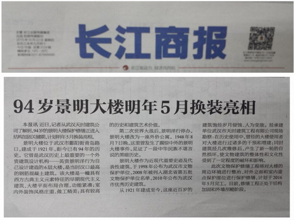 近期,长江日报、长江商报、武汉晨报等多家本地媒体相继对天时华体会hth·(体育)(中国)官方网站黄鹤楼、园博园“汉口里”、景明大楼等古建修复、外装工程项目进行报道。充分肯定天时华体会hth·(体育)(中国)官方网站在古建修复方面的精湛技艺,及为提升城市历史文化品味作出的不懈努力。