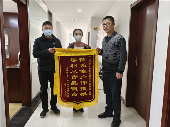 2月20日上午,上海路9号的周女士来到华体会hth·(体育)(中国)官方网站第一分华体会hth·(体育)(中国)官方网站,将一面印有“情系住户伸援手 尽职尽责品德高”的锦旗送到工作人员手中,衷心感谢华体会hth·(体育)(中国)官方网站房管人员、工程维修人员,高效及时帮助其解决家中下水管道油污堵塞问题,对他们认真负责的工作态度和为住户排忧解难的敬业精神表示由衷的肯定及感谢。