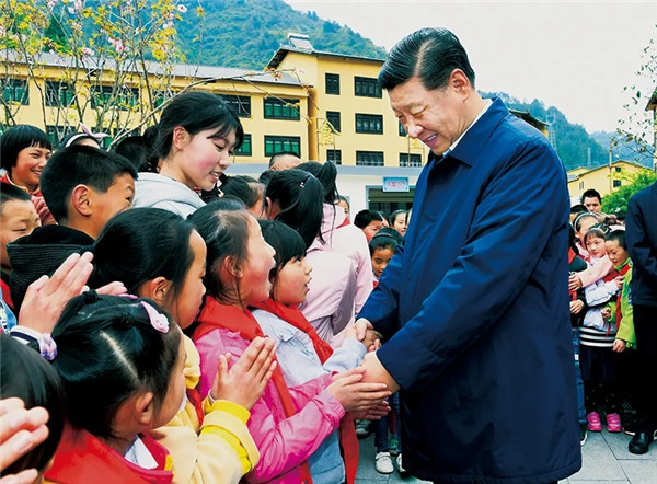 2019年4月15日至17日,习近平在重庆考察并主持召开解决“两不愁三保障”突出问题座谈会。这是15日,习近平在石柱土家族自治县中益乡小学同学生们交谈。